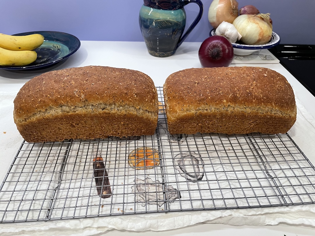 I made two loaves of my Harvest Grains Bread (adapted from KAF) I've doubled the recipe and use half bread flour and half WWW. This time I decided to use the 8 ½ x 4 ½ inch pans recommended. I really took the time to let it rise - because it was chilly here, it took a long time. I did put it in when it was ½ " over the rim instead of the full inch. It did rise, but looking at the slight blowout on the side I probably still underproofed it a little.